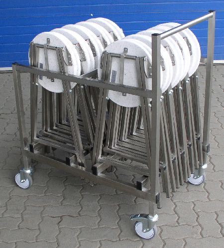 Besonders praktisch: Für den einfachen Transport mehrerer Hocker steht ein passender Transportwagen zur Verfügung, der bis zu 20 Stück aufnehmen kann – so bleibt alles ordentlich, mobil und schnell einsatzbereit.